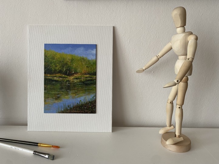 Obraz krajiny olejem "Jarní břeh u rybníka" 14,5 × 19,5 cm