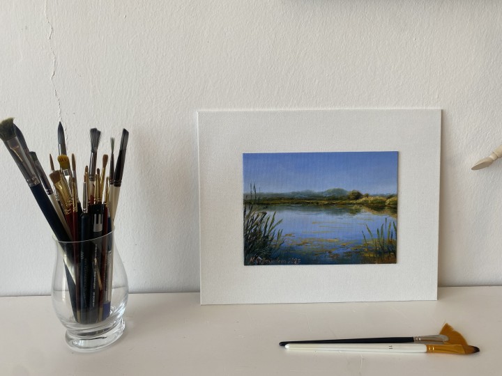 Miniaturní olejomalba zachycuje poklidný letní den u malého jezera. Modrá obloha se mísí s vodou, která působí uklidňujícím dojmem a připomíná teplé vzpomínky na dovolenou a léto.