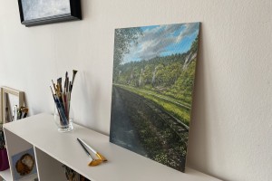 Obraz krajiny olejem "U trati", autorská replika 29 × 39 cm