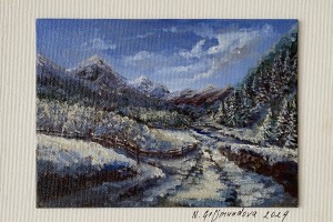 Ručně malovaný obraz olejem "Zimní horská pohádka" 18 × 13 cm.